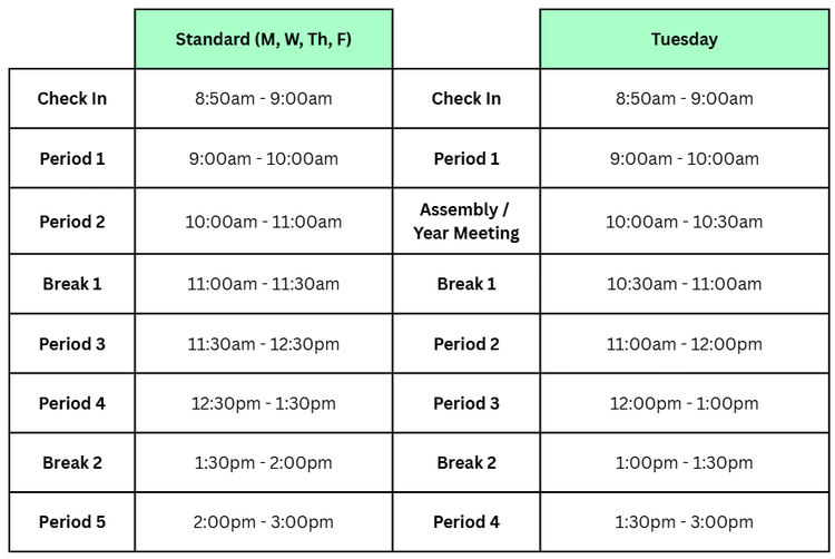 Our school day is structured around a clear timetable. We have set times for learning sessions, activities and lunch. Understanding the bell times helps students get the most out of each part of the day.